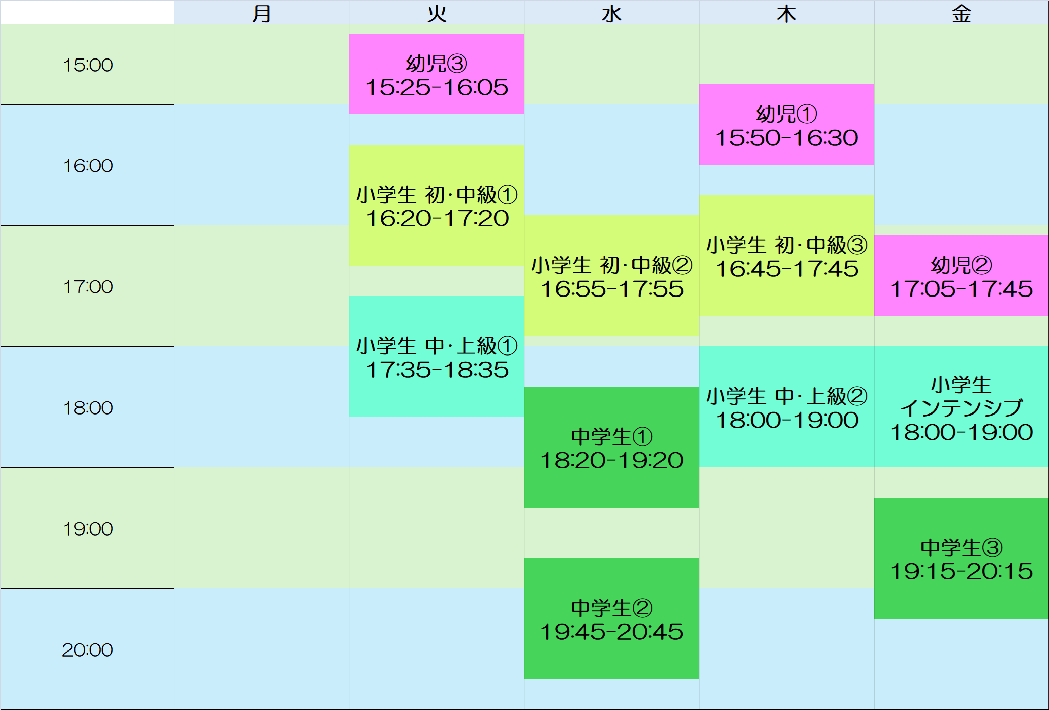 ・毎週木曜日 18:30~19:15(中級) - 初級 月) 17:15~18:00 幼児 火) 15:40~16:10 中級 木) 18:30~19:15